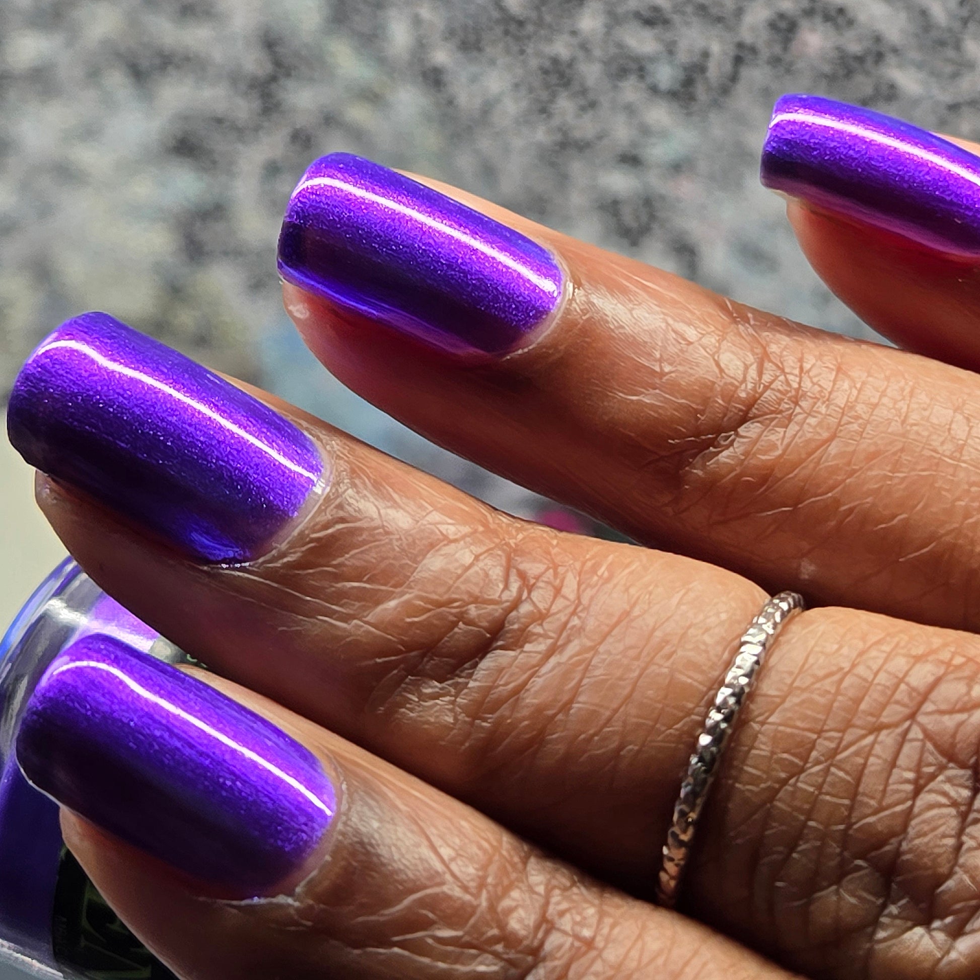 Unleash your dark side with this mesmerizing duochrome shimmer that shifts between electric blue and violet purple with every movement. Part of our bold Venom Collection, this nail polish delivers an edgy, multidimensional finish that commands attention. Watch the color transform as light dances across your nails, creating an intoxicating effect that's equal parts mysterious and striking. Perfect for those who dare to make a statement.