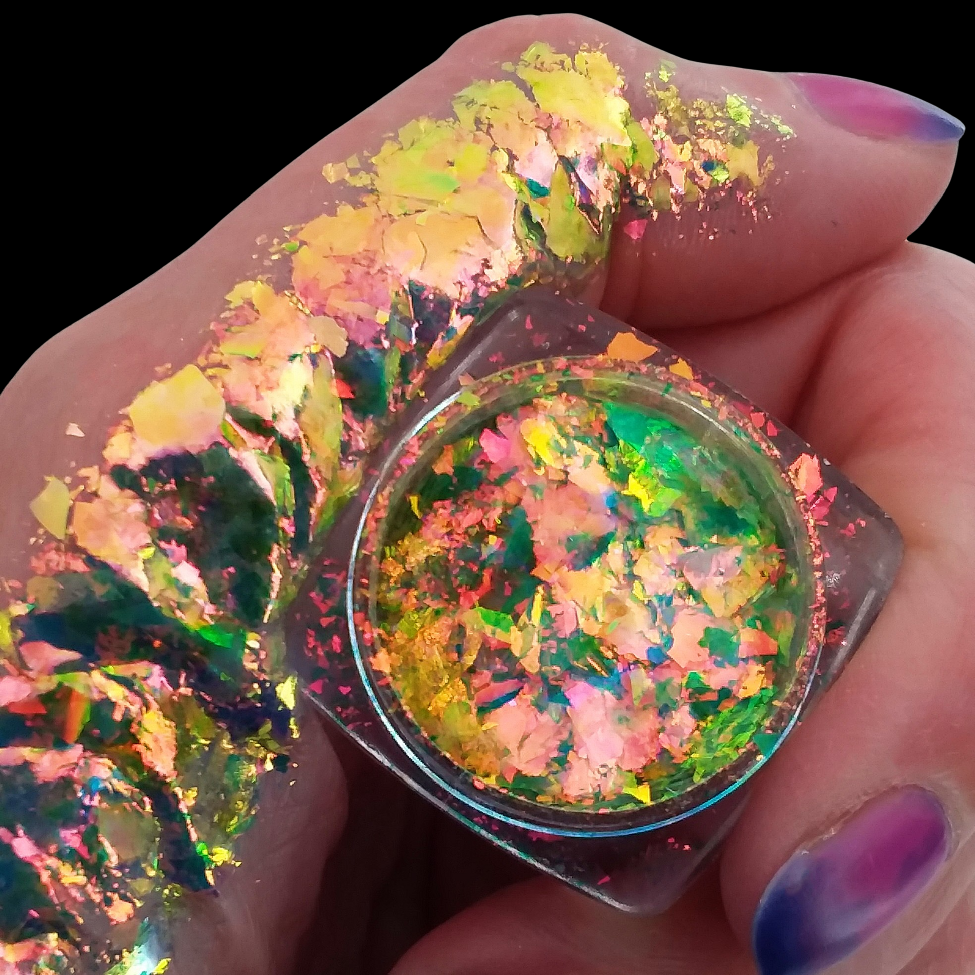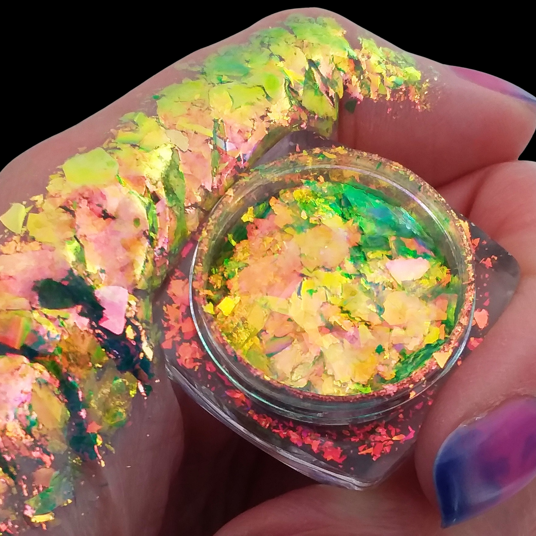 *Translucent Flakes look sheer in the jar and the colors bloom when applied to the skin.