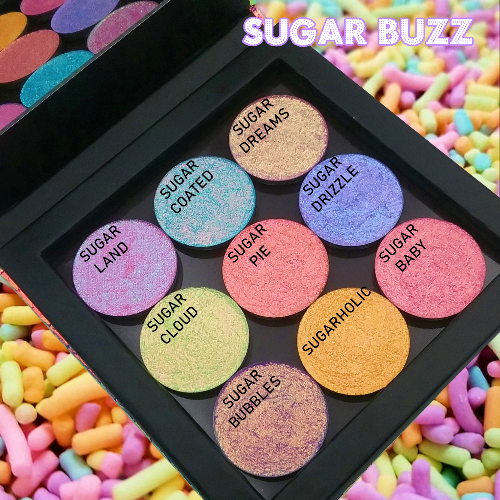 Our Sugar Buzz Collection are multichrome pressed eyeshadows. with extreme shifts and shine.